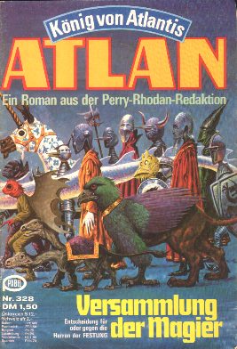 Während die Magier von Oth mit sich selbst beschäftigt sind, entschließen sich die “Seelenlosen”, die einst als Ausgestoßene in die Barriere kamen und bei den Magiern Unterkunft und Einkommen fanden, das Weltenfragment Pthor zu verlassen. Die Magier behindern die “Seelenlosen” nicht bei ihrem Versuch, schwimmend von der künstlichen Insel im Atlantik zu fliehen, doch scheitern die Flüchtenden letztlich am Paratron-Schirm, mit dem die Terraner Pthor vom Rest der Erde isolieren. Unter Mühen kehrt die Expedition aus der Tronx-Kette zum Karsion zurück und berichtet Glyndiszorn vom Beschluß, sich von den Herren der FESTUNG loszusagen. Erleichtert beendet der “Knotenmagier” seine Arbeit, läßt den Großen Knoten los, der sofort die gesamte Barriere von Oth einschließt und diese so mit einem wolkenartigen Energieschirm vom übrigen Pthor isoliert. Die drei Gordys im Luftschiff des “Wettermagiers” dagegen, bekommen dessen SARKA nicht unter ihre Kontrolle. Das Luftschiff irrt durch den Luftraum des Weltenfragments, bis es über dem Delta des Xamyhr abstürzt. Als Ssissnu beim Klettern durch einen schmalen Bergkamin in eine eigentlich für Koratzo gedachte Falle von Karsjanor gerät, versucht Wa ihn zu retten. Dabei verliert sie das Gleichgewicht und findet beim mehrere hundert Meter tiefen Sturz den Tod. Damit ist es erstmals zur Ermordung eines Magiers durch einen anderen Magier gekommen, auch wenn Karsjanor eigentlich nur Koratzo eine Lektion erteilen und niemanden töten wollte. Sein Ziel war es die ehemalige Geliebte zurückzuerobern, die nun statt dessen den Tod findet. Karsjanor verfällt endgültig dem Wahnsinn. Es ist nur eine Frage der Zeit, bis der Konflikt zwischen den verfeindeten Magiern sich vollends in einem Krieg der Magier entladen wird. Handlungszeit: 1. September 2648 n. Chr. Auf der LKS dieses Heftes beantwortet William Voltz die Frage zweier Leserinnen, ob mit dem Start einer 2. Auflage der Atlan-Serie zu rechnen sei, mit einem kategorischen Nein. Etwas mehr als ein halbes Jahr später, erscheint sie dann doch. © Schrotys Materiequelle |