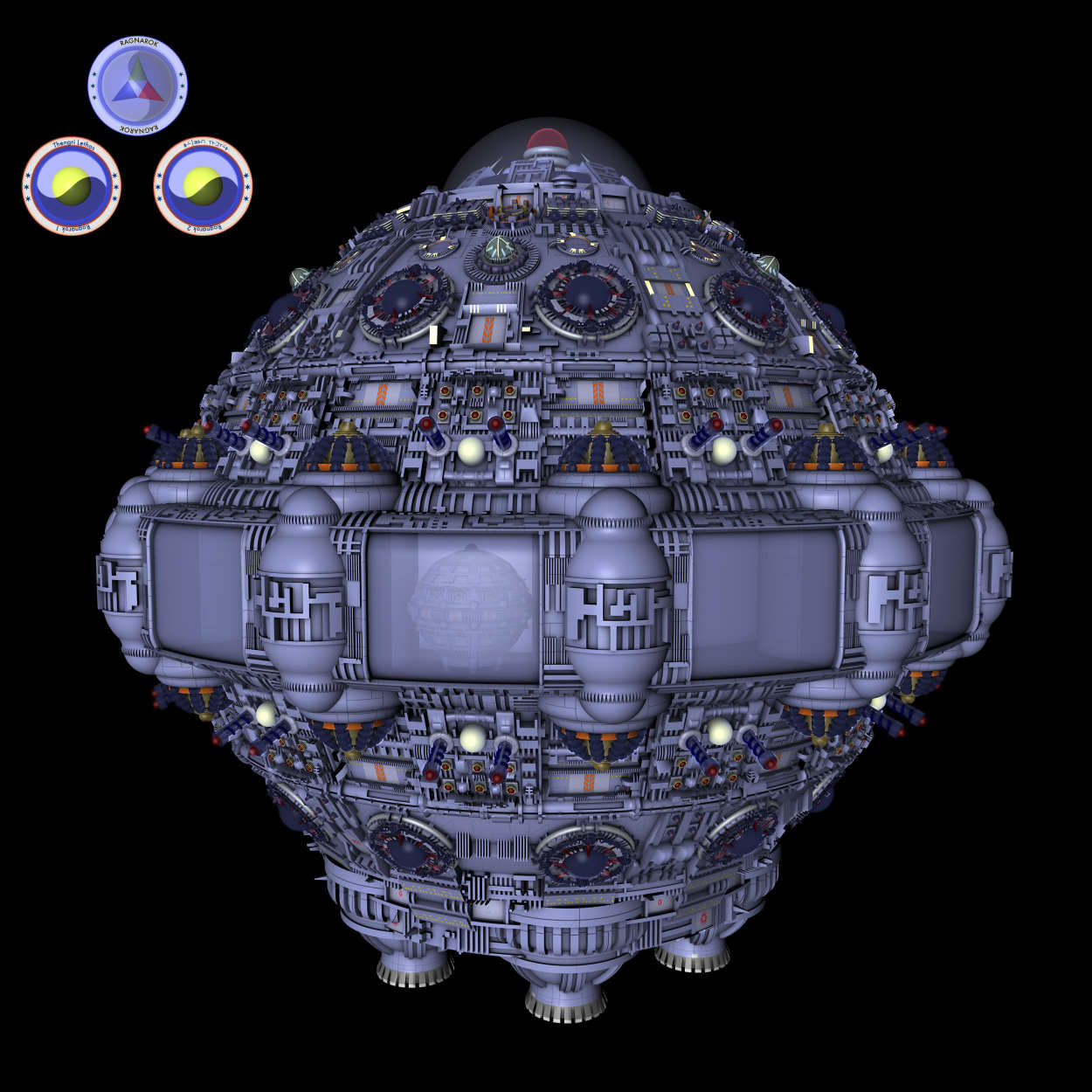 Schwesterschiff der Mirona Thetin: die Ragnarok. Sie ist das Flaggschiff der terranischen Flotte und der zwei nahezu baugleichen Einheiten, die ebenfalls mit 5D-Ultrahochfrequenztechnik ausgestattet wurden und so wieder die alten Qualitäten vor dem Hyperraumschock entfalten. Die drei Embleme in der linken oberen Ecke sind die Schiffskennzeichen der Mirona Thetin, der Thengri Lethos und der Ragnarok