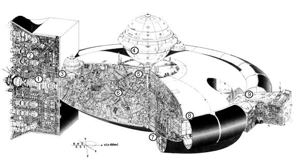 Bewaffnung: 120 Waffentürme verschiedenster Konzeption (Transformkanonen, Selphir-Fataro-Geschütze, Kombinationsgeschütze mit Thermo-, Desintegrator-,Paralyse-, oder Intervallwirkung), wobei in den 9 Hauptkuppeln des Zentralsegments ca.50 Prozent der Feuerkraft konzentriert des Schiffes sind