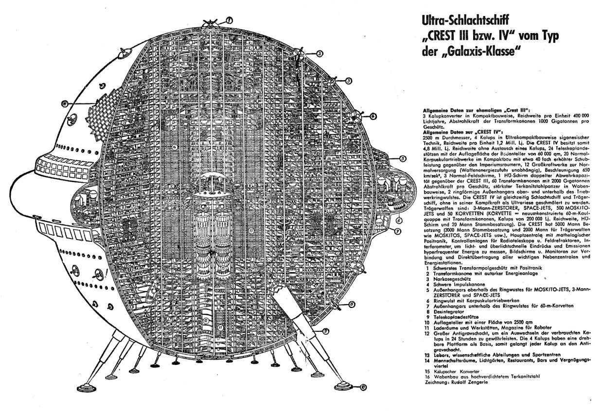 Im Jahr 2435 ist die CREST IV das Flaggschiff der terranichen Flotte und hat eine 2500m durchmessende Schiffszelle. Die CREST IV, der verbesserte Nachfolger des terranischen Flaggschiffes CREST III, besitzt gegenüber seinem Vorgängermodel anstelle 3 nun 4 Kalups in Ultrakompaktbauweise siganesischer Technik. Die Reichweite pro Einheit beträgt 1,2 Millionen Lichtjahre. Die CREST IV ist somit in der Lage 4,8 Millionen Lichtjahre zurückzulegen, ohne einen Kalup auszutauschen. Das Ultraschlachtschiff steht auf 24 Landebeinen, deren Auflageteller insgesamt 60000 m² Fläche bedecken. 20 Korpuskulartriebwerke erzeugen eine etwa um 40 Prozent höhere Schubkraft als bei den Raumern der Imperiumsklasse üblich. Die CREST IV besitzt 12 Großkraftwerke zur Energieversorgung, ausgenommen der Waffenstationen, die mit unabhängigen Aggregaten ausgerüstet sind. Die Beschleunigung des Schiffes beträgt 650 m/s². Als Defensivsystem verfügt die CREST IV über 3 Normal Feldschirme und einen verbesserten HÜ-Schirm, der die doppelte Abwehrkapazität der CREST III besitzt