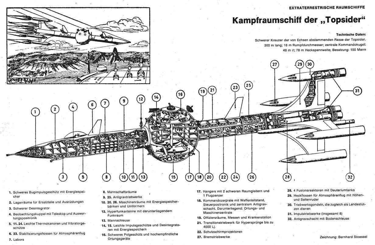 Der abgebildete Schiffstyp ist ein Schwerer Kampfkreuzer der Topsider und spiegelt den Stand der Entwicklung wieder, den die Echsenwesen aus dem Orion-Delta System zur Zeit ihrer Invasion im Wega-System erreicht hatten. Der Kampfkreuzer ist 300 Meter lang und hat einen Rumpfdurchmesser von 18 Metern. Die zentrale Kommandokugel durchmisst 48 Meter. Sie Heckspannweite der 4 angeflanschten Triebwerksschwingen beträgt 78 Meter. Die Stärke der üblichen Besatzung eines Kreuzers dieses Typs beträgt 150 Mann. Das Schiff besitzt ein Transitionstriebwerk und kann Hypersprünge von bis zu 4000 Lichtjahren durchführen.