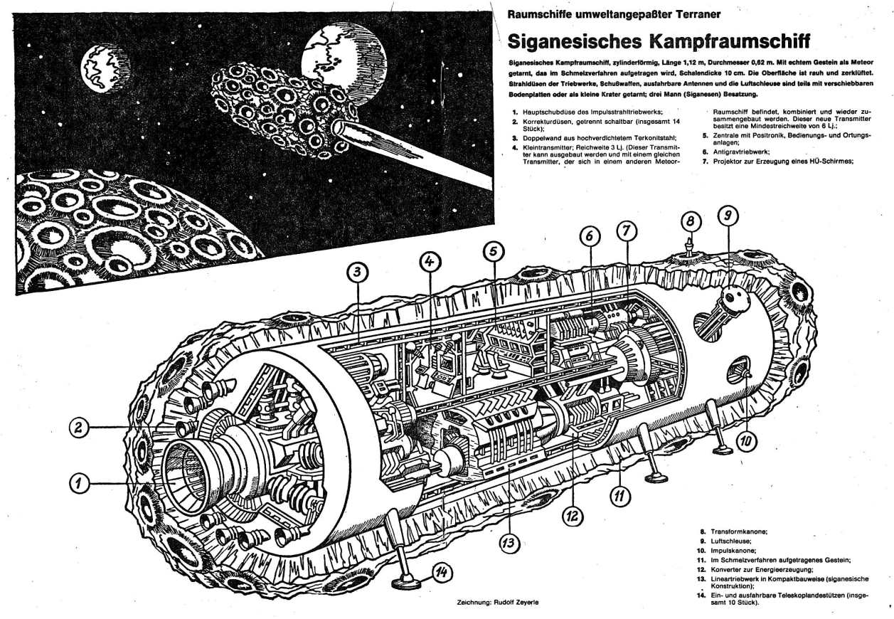 Siganesisches Kampfraumschiff, zylinderförmig, Länge 1,12 m, Durchmesser 0,82 m. Mit echtem Gestein als Meteor getarnt, das im Schmelzverfahren aufgetragen wird, Schalendicke 10 cm. Die Oberfläche ist rau und zerklüftet Strahldüsen der Triebwerke, Schußwaffen, ausfahrbare Antennen und die Luftschleuse sind teils mit verschiebbaren Bodenplatten oder als kleine Krater getarnt; drei Mann (Siganesen) Besatzung.