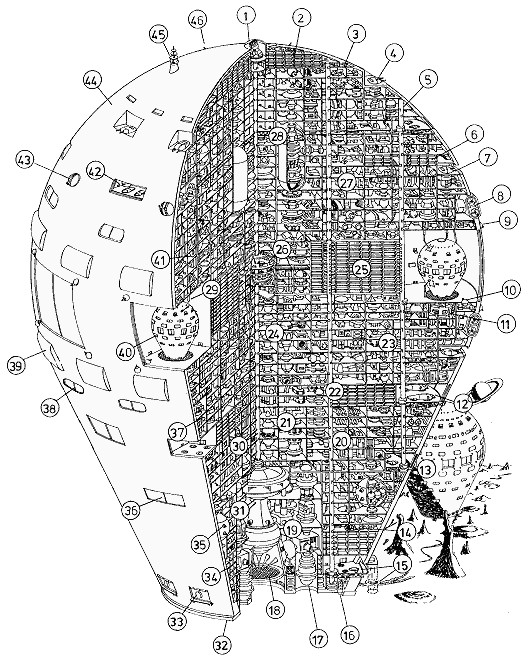 | 1. Observatorium 2. Astronomisch-wissenschaftliche Abteilung 3. Mannschleuse 4. Außen installiertes, drehbares, Zwillingsstrahlgeschütze 5. Lastenantigravschacht 6. Medizinische Abteilung 7. Innen installiertes Zwillingsgeschütz 8. Oberer Schutzschirmprojektorring 9. Äußerer Traktorstrahlprojektor 10. Im Hangar installierter Traktorstrahlprojektor 11. Beibootverankerung 12. 35x7 Meter Beiboot 13. Notschleuse und Antigravprojektor 14. Transmitterzentrale 15. Hangar für gepanzerte Geländefahrzeuge 16. Kurskorrekturtriebwerke 17. 8 Haupttriebwerke 18. Fremdkörperschutzgitter 19. Feldtriebwerk 20. Feldgeneratoren 21. Verteileranlagen und Umformer 22. Ausrüstungs- und Proviantlager 23. Wasser- und Abfallaufbereitungsanlagen 24. Schwerkraftprojektoren |