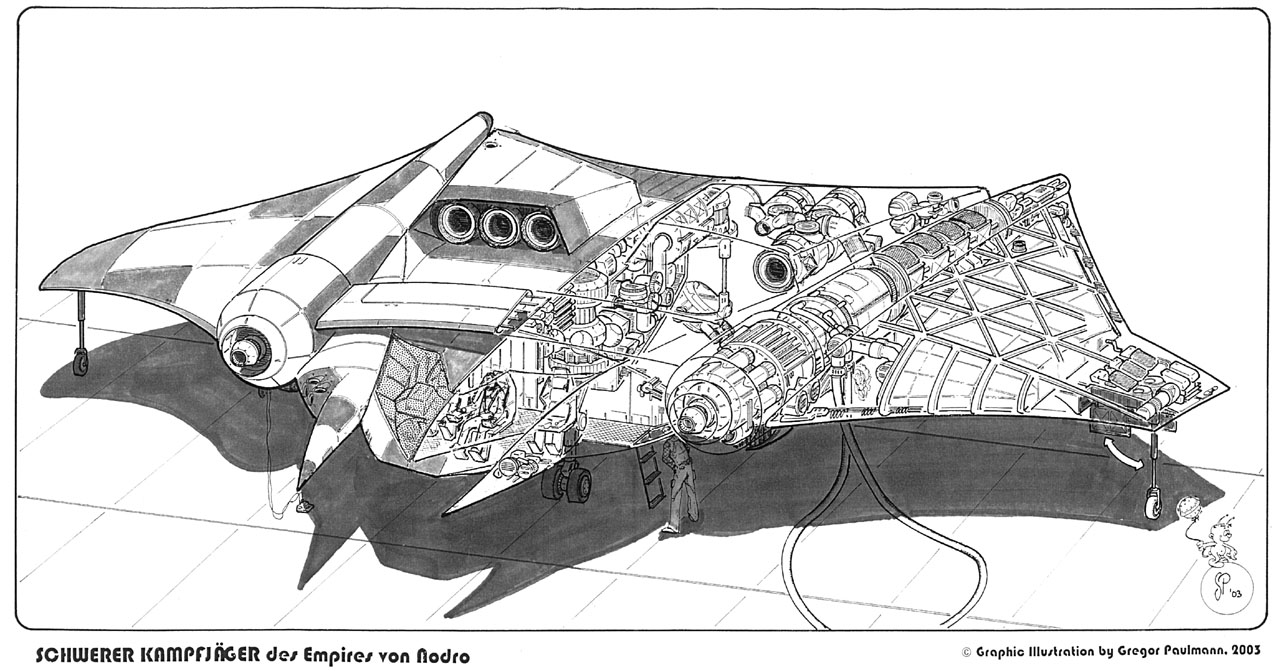 Allgemeines: 3-Personen Angriffsmaschine mit schwerer Offensivbewaffnung, sowohl vakuum- als auch atmosphärentaugliches Fahrzeug. Der schwere Kampfjäger des Empires ist als Nur-Flügler konzipiert. Diese Auslegung in Kombination mit adaptiver Flügel-Technologie macht die Maschine besonders innerhalb von planetaren Atmosphären zu einer konkurrenzlos effizienten Waffe. Darüber hinaus kann während dieser Flugphasen auf eine Unterstützung durch die Antigrav-Matrix verzichtet werden – eine Eigenschaft, die auch dem Ortungsschutz zugute kommt. Hauptenergiequelle stellen hier die Fusionsreaktoren dar. Durch sie werden sowohl Impulsantrieb als auch die Reaktionskanonen als Primärbewaffnung versorgt, die beide nach dem gleichen Grundprinzip der Beschleunigung und künstliche Anreicherung von Fusionsplasma arbeiten. Der Reaktionsprozess selbst wird durch eine myon-katalysierte Niedrigtemperatur-Fusion bei etwa 3000 K (+2726,8 °C) erzeugt. Als Brennstoff wird schwerer Wasserstoff (Deuterium), zur Abdeckung von Spitzenlasten zusätzlich Wismut verwendet. Der Brennstoff wird bei etwa 16 K (-257,15 °C) bei einer Dichte von etwa 7800 Kg/m³ mitgeführt, stabilisiert durch kraftfeld-stabilisierte Lagertanks. |