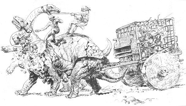abgefangen worden und werden zum Verhör nach Kortasch-Auromt verschleppt.Auf dem Inselkontinent Kortasch-Auromt existiert eine ganze Armee von großen Echsen, den Moojas, die über implantierte Empfänger kontrolliert werden. Die Tiere sind für Arbeiten und Kampf vorgesehen. Nachdem Fartuloon mit seinem Skarg der Gruppe zum Ausbruch verholfen hat, konstruiert er einen Verstärker für einen Kontrollsender, so daß er die Moojas auf der Insel der Kontrolle des Gouverneurs Mavillan Ruuver entziehen kann. Mit diesem Trumpf zwingt er den Gouverneur zum Verhandeln. Wie schon auf Broschaan bieten Atlan und Fartuloon an, das Gerücht zu überprüfen, ob Agmon tot ist. Sprangk und Eiskralle bleiben als Rückendeckung auf der Insel zurück, während Atlan und Fartuloon mit einem Gleiter Kurs auf Sebentool nehmen. Handlungszeit: 13. Ansoor bis 16. Ansoor 10.497 da Ark Anmerkung: © Schrotys Materiequelle Die Seite wurde erstellt von Bernd Labusch © Romanzusammenfassung von Torben Kneesch |
