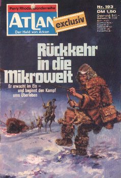![]() Als Atlan auf Skrantasquor erfuhr, daß Prinzessin Crysalgira von den Maahks gefangengenommen und in den Mikrokosmos geschickt wurde, setzte er alle ihm zur Verfügung stehenden Mittel ein, um ihr in das fremde Kontinuum zu folgen. Erneut wurde der Kristallprinz der Strahlung eines Zwergenmachers ausgesetzt, doch materialisiert er nicht im Reich der Dnofftries, sondern in einer Eiswüste, mit letzter Kraft schleppt er sich in eine kleine Höhle, wo er erschöpft einschläft.