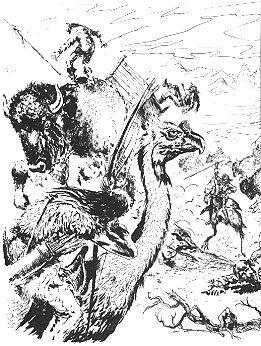 Die Höhle diente den Bewohnern der Eiswüste als provisorische Jagdhütte. Als Atlan die Höhle verläßt, entdeckt er einen Gürtel mit Geschirr und einen zotteligen Büffel, der seinem Besitzer als Reittier gedient haben muß. Der Arkonide vertraut sich dem Büffel an, wird jedoch nach kurzer Zeit von einer Jagdgesellschaft angegriffen. Diese setzt sich aus Menschen zusammen, denen große Laufvögel als Reittiere dienen. Sie erlegen den Büffel und verschleppen Atlan als ihren Gefangenen in die kleine Ortschaft Krothenbeet, die fast ausschließlich aus einem einzigen Landgut besteht. Die Krothenbeeter sind humanoid, eigentlich vollständig menschlich, nur ihre Gesichter erscheinen dem Arkoniden abgrundtief häßlich. Daher ist es für Atlan unangenehm als sich Gjeima, die Tochter des Rats von Krothenbeet Dophor, in ihn verliebt. Mangels eines besseren Ziels macht sich der Kristallprinz in den nächsten Tagen für die Krothenbeeter nützlich, indem er zum Beispiel versucht eine Maschine namens Bruzack zu reparieren, die sich als rostiger alter Gleiter erweist. Krothenbeet bildet zusammen mit der Ortschaft Darga ein kleines Fürstentum, dessen Sicherheitschef Kardhyn mit einer Patrouille in der Ortschaft einkehrt. Der Patrouillenreiter mißtraut Atlan zutiefst. Von Dophor erfährt Atlan, daß das Volk von Darga im Krieg mit dem Volk der Krethor lebt, die als Nomaden durch die Eiswüste ziehen und Dörfer wie Krothenbeet überfallen. Ihnen hatte die kleine Höhle gehört, in der der Kristallprinz nach seiner Ankunft im Mikrokosmos Unterschlupf gesucht hatte. Bei einem Ritt Richtung Süden entdecken der Arkonide und Dophor, daß die Krethor bereits einen Großangriff auf das Dorf vorbereiten. Trotz Atlans Hilfe gelingt es nicht, Krothenbeet gegen die Invasoren zu verteidigen. Außer dem Arkoniden und Gjeima werden alle Bewohner der Ortschaft, die den Fremden in die Hände fallen, von den Büffelreitern getötet. Atlan und die Tochter des Rats sollen am nächsten Tag verhört werden. Sie können sich jedoch, am Abend als die Krethor ihren Sieg feiern, heimlich befreien und mit dem alten Gleiter entkommen. Handlungszeit: 26. Coroma bis 29. Coroma 10.498 da Ark © Schrotys Materiequelle © Seite von Bernd Labusch |