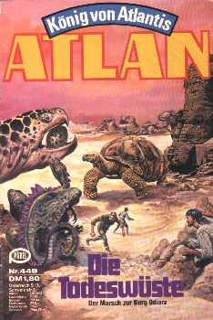 ![]() ![]() So beginnt ihre Wanderung durch Churrum vom Neuen. Kurz vor der Dämmerung müssen Razamon, Kennon und Atlan in einer Höhle Schutz vor einem extrem starken Sandsturm suchen. Am nächsten Morgen stellen sie überrascht fest, daß der Hügel, in dessen Hang sich ihr Nachtquartier befindet, der Rückenpanzer einer riesigen Wüstenschildkröte ist, die sich auf einer langen Wanderung nach Westen befindet. Atlan tauft ihr Reittier aus einer Laune heraus Mathilda. Sie gehört zu einer ganzen Herde von Riesenschildkröten, die sich am Grund eines ausgetrockneten Salzsees treffen um dort zu Balzen und ihre Eier abzulegen. Anschließend stürzen sich die Raubsaurier der Wüste auf die Riesenschildkröten, aber nicht um diese anzugreifen, sondern um in den Höhlen der Rückenpanzer der Echsen ihre Eier abzulegen, die dann von der Körperwärme der Wüstenschildkröten ausgebrütet werden. Nach dieser Episode auf dem Salzspiegel setzen Atlan, Kennon und Razamon ihre Reise auf dem Rücken Mathildas fort, bis sie das Hochgebirge im Westen von Dorkh die Große Barriere von Shatna erreichen. Nach einem kurzen, kraftraubenden Marsch befinden sie sich am Fuß eines Berges auf dessen Gipfel sich eine Burg erhebt, die für Zyklopen errichtet scheint. Mit letzter Kraft erklimmen die drei Wanderer den Gipfel und gelangen in die Burg Odiara. Die drei Unsterblichen werden vom Burgverwalter Kuashmo überraschend herzlich empfangen. Handlungszeit: Juni 2650 n. Chr. © Schrotys Materiequelle |