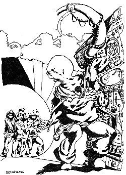 ![]() ![]() Unter den Wartenden ist auch Riisa der Häuptling der Puntharen, der auf Befehl der Technos die jährlichen Tribute an das SCHLOSS überbringen soll. Zu den Tributen der Puntharen gehören auch Sklaven aus Riisas eigenem Volk, darunter die junge Deela. Wovon im Stamm niemand etwas ahnt, der junge Aoore Zwiebart und Deela bilden seit längerem ein heimliches Liebespaar. Vom Liebeskummer getrieben macht sich der junge Punthare auf den Weg seine Geliebte zu befreien, unterstützt wird er bei seinem Abenteuer vom Wandersöldner Tirkis aus dem Jagdteppich. Fahrende Händler versuchen den Wartenden die Zeit mit Speis und Trank zu verkürzen, dennoch kommt es zu Spannungen zwischen Abgesandten und Sicherheitskräften, die sich in einer wilden Schießerei entladen. Mit Unterstützung des Technos Ghyderzan und des Tormagiers Xerylh gelangen die Pthorer ins SCHLOSS. Als Gegenleistung verlangt der alte Magier nur, daß Atlan die beiden jungen, erst vor kurzem ins SCHLOSS verschleppten Magier Fiothra und Asparg befreit. Aoore setzt sich an die Spitze der Revoltierenden, die sich mit Gewalt Zugang zur Residenz der Neffen verschaffen. Im SCHLOSS kommt es zu einer Meuterei der Technos, als die Herren des SCHLOSSES in Panik geraten und widersprüchliche Befehle geben. Das Portal wird geöffnet und die aufgepeitschte Menge strömt ins Innere der Anlage. Aoore gelingt es den Aufenthaltsort der frisch eingelieferten Sklaven zu erfahren und diese zu befreien. Unter den Befreiten ist eine Reiterei der Zukahartos, die vom Patriarchen Sserda angeführt wird. Die Nomaden plündern ein Magazin der Technos, rüsten sich mit Waffen aus und heizen die Kämpfe zusätzlich an. Das Chaos hat längst kaum zu beherrschende Ausmaße angenommen, als die Herren des SCHLOSSES sich dazu durchringen ihre Raumschiffe zu verlassen und selbst in die Kämpfe einzugreifen. Es handelt sich bei den Statthaltern des Dunklen Oheims auf Dorkh zu Atlans Überraschung um fünf uralte Uleb. Handlungszeit: Juli 2650 n. Chr. © Schrotys Materiequelle |