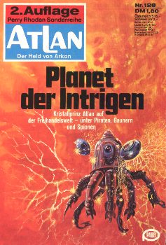 InhaltWelt der Intrigen: (Heft 128, 130, 132 134)Handlungszeit: 10.497 da Ark bzw. 8023 v. Chr. Als 1. Auflage erschienen: März 1974 bis April 1974 Als 2. Auflage erschienen: Februar 1981 bis März 1981 Als Hardcover erschienen: Herbst 2001 und Frühjahr 2002 Situation: Nachdem sich die Lage an der Sogmanton-Barriere geklärt hat und Farnathia sich auf dem Weg der gesundheitlichen Besserung befindet, nimmt Atlan den Kampf gegen die Macht Orbanaschols auf. Doch die Mittel und Möglichkeiten des Kristallprinzen sind begrenzt. Er muß sich vorerst mit einer Guerillatätigkeit zufriedengeben Dies zeigt auch sein Einsatz auf der Freihandelswelt Jacinther IV, bei dem es Atlan und seine Gefährten darum geht, die internen Streitigkeiten der Gouverneuer des Planeten anzuheizen und mit dem Wirtschaftsminister des Großen Imperiums Freemush, eine wichtige Persönlichkeit in ihre Gewalt zu bekommen. Der Weg zum Ziel führt über den planetaren Statthalter Fertomash Agmon, der sich seit Jahren nicht mehr in der Öffentlichkeit gezeigt hat. Er gilt als zumindest gesundheitlich stark angeschlagen und seine Gouverneure sind fest davon überzeugt, daß mit der Ankunft Freemushs ein neuer Statthalter des Planeten der Intrigen ernannt wird. Die Aktivitäten der Geheimdienste beginnen sich zu überschlagen. Atlan-Heftliste: 128. Planet der Intrigen (Ernst Vlcek) 130. Meister der Echsen (Clark Darlton) 132. Die Burg des Tyrannen (Hans Kneifel) 134. Flucht ins Chaos (H.G.Francis) Diese Romane sind auch enthalten im Atlan-Hardcover Nr. 19. Piraten der Sterne und Nr. 20. Flucht ins Chaos ![]() Allgemeine Überlegungen von Torben Kneesch:ACHTUNG SPOILER !!! Da "Der Held von Arkon" in diesen Tagen in Form von Blaubänden erscheinen soll, sollten Leser der Blaubände diesen Text nur auf eigene Verantwortung lesen.Nachdem Farnathia in Sicherheit ist, wissen unsere Helden nicht so recht, wie sie Orbanaschol schaden sollen (wahrscheinlich, weil es die Autoren auch nicht wußten). So reisen sie erst einmal mit einigen Piraten zur Freihandelswelt Jacinther IV, wo sie aber schnell von der baldigen Ankunft des Ökonom Freemush erfahren, dem Hauptverantwortlichen für den Handel im Imperium. Daher wollen unsere Helden Freemush entführen. Also mal ganz hart ausgedrückt: Dieser Abschnitt ist als erster so richtig langweilig. Im ersten Band erfährt Atlan von Freemush, im letzten Band kassiert er ihn ein. Die Bände dazwischen dienen nur zum Füllen. Atlan und Fartuloon lernen die Kontinente von Jacinther IV kennen und bekommen es mit diversen Gouverneuren zu tun. Allerdings wirkt der Planet für eine der bedeutendsten Handelswelten eines riesigen Sternenreichs erschreckend primitiv. Ein Phänomen, das in diesem Zyklus öfters auftritt und schon einen Trend zur Fantasy aufzeigt. Übrigens bekommt das Skarg Fartuloons in diesem Zyklus einige seiner Fähigkeiten zugesprochen. Einmal wird es von Fartuloon benutzt, um die Energie eines Blitzes zu speichern und zum Durchschweißen von Gittern zu benutzen, und an anderer Stelle schneidet er mit dem Skarg eine Strukturlücke in einen Schutzschirm. Seitenanfang © Schrotys Materiequelle Seite von Bernd Labusch © Kommentar von Torben Kneesch |