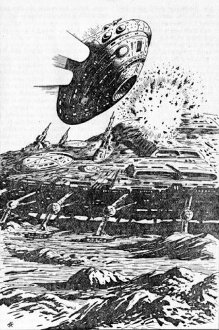 Mit einer Space-Jet der SAMBAL landen Roi Danton, Naomi Phars, Brado Gordon und Fedder Napsus auf Nand. Dort beobachten sie den riesigen, von vierhundert Goon-Blöcken angetriebenen Räumroboter des Armadaschmieds Warckewn, dessen Kern ein eintausendzweihundert Meter hoher und viertausend Meter durchmessender, unregelmäßiger Zylinder bildet. Sechzehn gelenkige Ausleger geben dem Gebilde einen Umfang von einhundert Kilometern. Mit den an ihren Enden angebrachten Tellern von achthundert Metern Durchmesser kann der Räumroboter gewaltige Massen von Erdreich mit wertvollen Mineralien in den Zentralkörper saugen. Dadurch ruft der Robot auf der Oberfläche Nands unvorstellbare Verwüstungen hervor. Als Danton und seine Begleiter von einem der zahlreichen, den Räumroboter begleitenden Armadamonteuren bedroht werden, rettet sie der Nandire Sidri, indem er eine Lawine auslöst.
