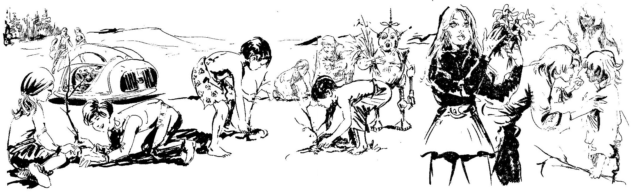 Zurück an der Oberfläche schickt sie die Überschweren in die Hauptstadt – sie sollen sich eine neue Aufgabe suchen. Danach fliegt sie auf dem schnellsten Weg nach Sharinam, zum »Regierungsgebäude«. Zuerst trifft sie Aramus Shaenor, den sie auf die Gefahr aufmerksam macht. Dieser ist nicht zu überzeugen und tut die Bildergeschichte nur als Märchen ab, die Linguiden sind die legitimen Nachkommen der Superintelligenz ES. Als er sich über die Haare streicht, stellt er fest, dass ihm die Haare ausgehen.