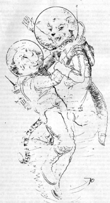Auf der anderen Seite der Pink Barrier herrscht nur noch eine Schwerkraft von zwei Gravos, eine Funkverbindung zu den anderen ist nicht möglich. Plötzlich werden die beiden Galaktiker von tierähnlichen Kristallrobotern angegriffen. Sie teleportieren zurück, da sie schon geespert haben, das im Zentrum des Schiffes etwas existiert, was aus acht bis dreißig Gedanken besteht, wie Gucky es salopp ausdrückt.