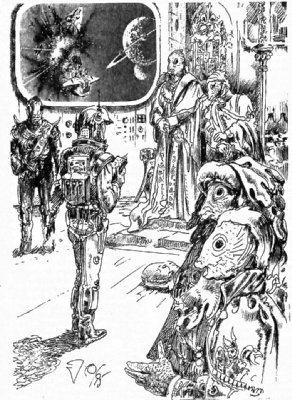 Der Ferm-Kommandant Ten-Or-Too behauptet, die beiden Galaktiker seien von der göttlichen Gomasch Endredde geholt worden, wie auch immer das abgelaufen sein soll. Rhodan schenkt dem Fermyyd Glauben und darf sich ungeschoren zurückziehen. Die vier Schiffe verlassen am 15. August das Demmyd-System in Richtung BASIS und SCHERMOTT.