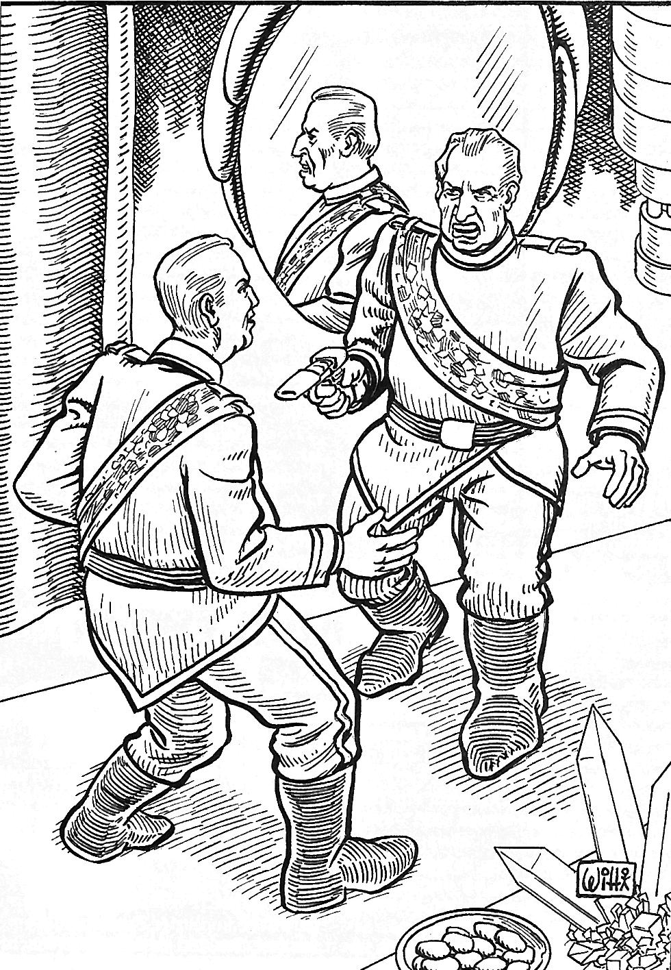 Und: Wrehemo ... Wrehemo Seelenquell! Plötzlich wußte er, wie die Superintelligenz entstanden war. Er wußte, daß Morkhero derjenige war, der vor dem Schiff lag, und Wrehemo die Monochrom-Mutanten in sich aufnahm. Dann ein quälender Hilfeschrei, eine Einsicht, die aber viel zu spät kam: Auf dem Weg zur Superintelligenz kann man keine Abkürzung nehmen! Und Rhodan spürte ... grenzenlose Gier. Machtbesessenheit. Verachtung für alles Leben. Rhodan spürte die Qualen der Monochrom-Mutanten, die gegen ihren Willen in der Regenbogenkugel aufgingen, hin und her gerissen zwischen Hoffnung und Verzweiflung. Der Tod war ihnen gewiß, doch diese körperlose Existenz hatte ihnen wahrlich nicht vorgeschwebt. Der Terraner wußte spätestens seit den Verhandlungen mit Hismoom, daß man weder Kosmokraten noch Superintelligenzen nach menschlichen Maßstäben messen konnte. Moralische Vorstellungen selbst eines Unsterblichen hatten für solche Entitäten keine Gültigkeit. Aber Rhodan konnte, auch wenn er sich jeder moralischen Einschätzung enthielt, die parasitäre Natur der Entität nicht ignorieren, die vor seinen Augen entstand. Sie verschmolz weniger mit den Bewußtseinssplittern der Mutanten, als daß sie sie fraß wie ein gieriger Moloch, ihre Kräfte aufsog und sich einverleibte. Und er ... er konnte nichts gegen diese unbeschreibliche Genese tun. Er konnte nur beobachten. In einem Augenblick beklemmender Hilflosigkeit spürte Rhodan, daß er die Entstehung einer Superintelligenz miterlebte, und war zweifelsfrei davon überzeugt, daß es sich um eine negative handelte. (PR 2050) Niemand vermag zu sagen, wie viele Hände inzwischen unter dem direkten Einfluß SEELENQUELLS stehen; ihre Zahl dürfte allerdings in die Millionen (oder gar Milliarden ...?) gehen, und es wird selbst beim massiven Einsatz von PsIso-Fluid und Multi-Zheosin schwierig werden, alle in naher Zukunft »auszuschalten«. Ein Teilziel kann allerdings schon erreicht werden, wenn jene, die an den maßgeblichen Schaltstellen der Macht sitzen, befreit werden können - so geschehen bei vielen Regierungsmitgliedern und Flottenbefehlshabern der Blues. Zug um Zug sind die Galaktiker vorgegangen, im Versuch, das Heft des Handelns an sich zu ziehen und SEELENQUELL seiner konventionellen Machtbasis zu beraube. Die Posbis wurden befreit, mit dem Residenzfunk unablässig die wahren Zusammenhänge verkündet, das Solsystem ebenso zurückerobert wie das noch vor SEELENQUELL besetzte Kreit-System. Mit der Ausrufung des Trav'Tussan am Morgen des 24. Mai 1304 NGZ - entspricht dem 19. Prago des Tedar 21.423 da Ark - wurde dann ein weiterer Schritt vollzogen.