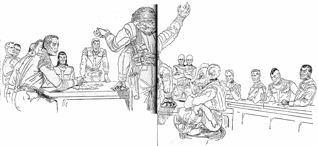 Unterdessen erhält der tefrodische Geschwaderkommandant Joakin Einhundertvierundzwanzig von der Hauptzentrale, die bei der Bildübertragung durch das »Große Symbol«, zwei Galaxien auf schwarzem Grund, repräsentiert wird, den Befehl, die Machtmittel des Big-Blue-Planeten gegen das vermeintliche Haluterschiff zu aktivieren.