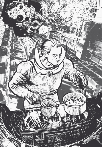 Die RHYLINE dringt in die Anomalie ein. Saedelaere legt zunächst einen Zwischenstopp bei der Space-Jet B-SJ-031 ein, die er schon bei seinem ersten Aufenthalt in der Anomalie entdeckt hat. Diesmal entdeckt er dort einen Überlebenden - jedenfalls gelingt es ihm, Funkkontakt mit einem Koch namens Endreas Konno herzustellen. Der Mann ist jedoch schon lange tot. Er hat die Flucht aus der BASIS und die Versetzung in die Anomalie nur überlebt, weil er als einziges Besatzungsmitglied der Space-Jet in einer Art Zeitfeld gefangen war. Dieses Zeitfeld versetzt Funksprüche von der Vergangenheit in die Zukunft und umgekehrt. Im Unterschlupf Konnos liegt nur noch dessen Leiche. Er muss längere Zeit in völliger Einsamkeit verbracht haben.