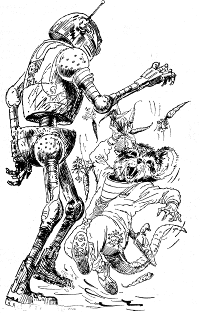 Am 7. April 2436, achtundvierzig Stunden nachdem Perry Rhodan sein Ultimatum gestellt hat, nimmt Agen Thrumb mit der CREST IV Kontakt auf und bietet einer terranischen Verhandlungsdelegation freies Geleit ins Dewell-System. Mit einer Space-Jet fliegen Major Tschai Kulu, John Marshall und Gucky in das System der Aphaneus, im dem inzwischen die fünfundachtzig Kilometer große Raumfestung des Druisanten Kibosh Baiwoff eingetroffen ist, der auf der Brust zweiundzwanzig blaue Steine trägt und somit reinen höheren Rang einnimmt als sein Artgenosse Agen Thrumb. Um Rhodans Drohung zu untermauern, händigen die Terraner den Stützpunktingenieuren einen Film des fiktiven Bestienplaneten aus. Es ist auf einer Dschungelwelt in der Milchstraße aufgenommen worden, auf dem Haluter in der Drangwäsche sportlichen Wettkämpfen nachgehen. Kibosh Baiwoff und Agen Thrumb erklären sich bereit, Kulu, Marshall und Gucky in die CREST zu begleiten. Da ihn die Bereitschaft mit Mißtrauen erfüllt, mit der die beiden Stützpunktingenieure ihre Ausrüstung beim Betreten des terranischen Flaggschiffes abgeben, verläßt Gucky die CREST und fliegt zu dem wenige Lichttage entfernten Raumschiff der Haluter.