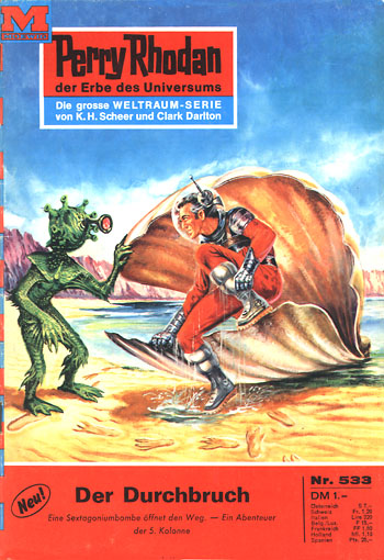 Unterdessen explodiert in der INTERSOLAR der junge Ingenieur Holander Loomen bei dem Versuch, per Transmitter durch die Strukturlücke im Schmiegschirm in die GEVARI zu springen.