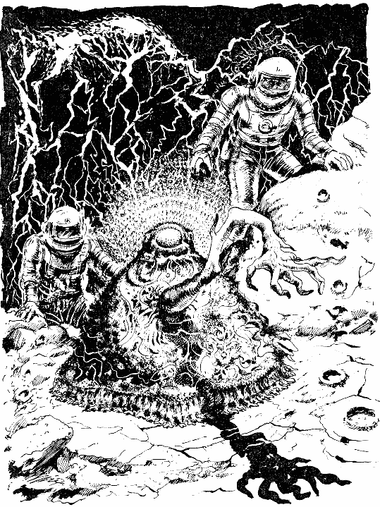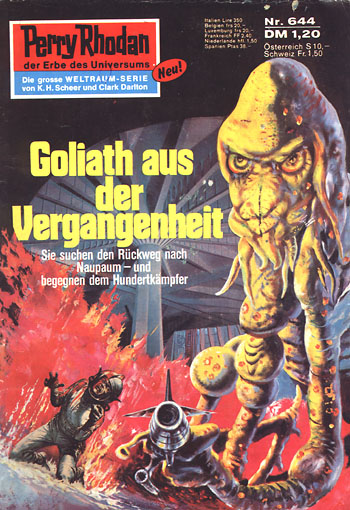 Auf dem Weg zum Ausgangspunkt der Catron-Ader, der Energieverbindung zum Planeten Yaanzar, dringen Rhodan-Toraschtyn, Zeno, Gayt-Coor, Torytrae, Heltamosch und dessen eintausendzweiunddreißig Raytaner in die militärischen Anlagen Payntecs vor. Die dort herrschende Uyfinom-Strahlung erlaubt es dem Pehrtus-Gehirn, die Herrschaft über Donktosch zu erringen. Es flieht und läßt sich in den Schädel eines Hundertkämpfers transplantieren. Der hartschalige Körper des drei Meter großen Androiden ähnelt mit seinen vier Paar Gliedmaßen und dem insektoiden Kopf den ausgestorbenen Pehrtus. Das riesige Wesen, dem Rhodan den Namen Goliath gibt, greift die Raytaner zusammen mit einer Gruppe von Robotern an. Mit Hilfe einer Schleuder kann der Terraner den Hundertkämpfer aber durch ein Uyfinom-Geschoß niederstrecken. Das Pehrtus-Gehirn wird in den Körper Donktoschs zurückversetzt, damit es den Weg zur Catron-Ader weist, durch die Rhodan und Torytrae nach Naupaum zurückkehren sollen, um Hilfe zu holen. |