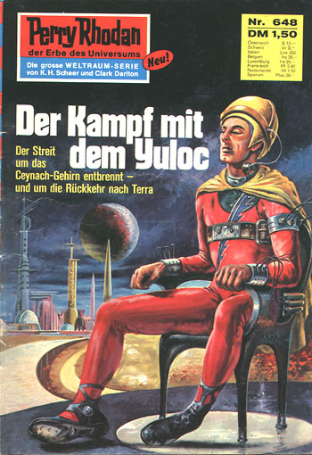 Der Versuch Doynschtos, Perry Rhodans Gehirn am 24. April 3458 von der PGT-Anlage auf Payntec in die heimatliche Galaxis abstrahlen zu lassen, wird von Torytrae sabotiert. Der Yuloc möchte den Völkern Naupaums das Gehirn des Terraners als Ratgeber erhalten und es in der Tschatro-Bank auf Yaanzar deponieren. Um Rhodan seiner Macht zu berauben, bezeichnet er ihn und Heltamosch gegenüber dem Robotgehirn des Planeten als Verräter an den Interessen der Pehrtus, doch der Terraner kontert, indem er Torytrae als Yuloc und damit als Erbfeind der Pehrtus entlarvt. Das Zentralgehirn setzt daraufhin sämtliche Wachroboter auf Torytrae an, doch Rhodan verbietet ausdrücklich, den Tuuhrt zu töten. Torytrae entkommt und stößt in einem weit von der Schaltzentrale entfernten Abwehrfort auf den zwei Meter großen pehrtusischen Vernichtungsroboter LB-17, der von der Zentralpositronik unabhängig ist und ihn als einen seiner verschollenen Herrn anerkennt. Nachdem LB-17 auf sein Geheiß ein Beiboot gekapert hat, versucht Torytrae Rhodan mit der Drohung zur Aufgabe zu zwingen, daß er mit Hilfe des Roboters den Planeten Payntec von einer Kreisbahn aus vernichten werde. LB-17 revoltiert jedoch, als er vom zentralen Robotgehirn über die wahre Natur des Yulocs informiert wird. Torytrae flieht erneut, aber die Zentralpositronik landet sein Schiff durch Fernsteuerung und verurteilt den Yuloc zum Tode. Erst als Rhodan das Robotgehirn zwingt, das Todesurteil aufzuheben, gibt Torytrae seine Pläne auf. |