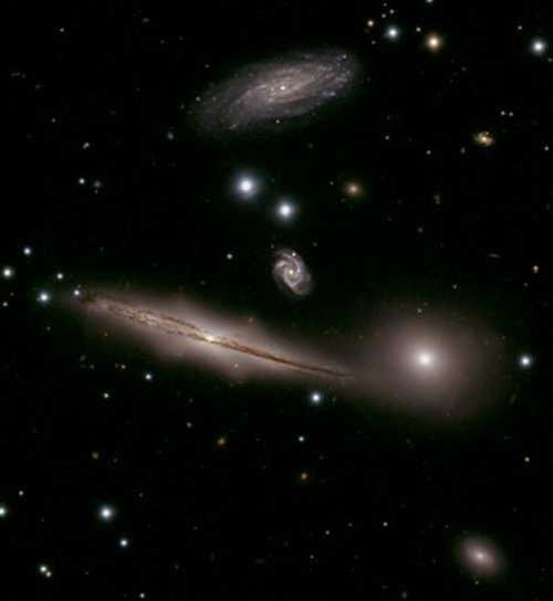 Diese drei Galaxien liegen so dicht beieinander, dass ihre Struktur durch die wechselwirkenden Gravitationskräfte zerstört wird. Darüber hinaus wird der Gasfluss zwischen ihnen verstärkt. Dieser Gasaustausch intensiviert in weiterer Folge die Aktivität der Kernregionen und die Bildung neuer Sterne. Die Spektralanalyse der schmalen Spiralgalaxie nahe dem Zentrum der Gruppe liefert keinen eindeutigen Hinweis, ob es sich dabei um ein Hintergrundobjekt oder um ein viertes Mitglied handelt. Innerhalb der PERRY RHODAN-Serie ist diese Galaxiengruppe identisch mit dem Reich Tradom. Von der Erde aus betrachtet befindet sich diese Konstellation im Sternbild Steinbock in einer Entfernung von knapp 388 Millionen Lichtjahren.