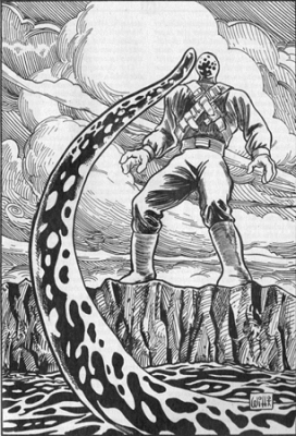 Rishtyn-Jaffami profitierte nicht nur von den pararealen Strömungen, sondern brachte sie unter seine Kontrolle. Jahrtausende vergingen, bis er eine Pararealität geschaffen hatte, die er Quintatha nannte - in Anlehnung an die alte Heimat, aus der die Jaffami einst ausgewandert waren. Ebenfalls in Anlehnung an die Traditionen seines Volkes gestaltete er Quintatha als »Ozeanwelt«, in der Seefahrer und riesenhafte Geschöpfe ein parareales Leben führten. die Barkner und dieTitanen. Quintatha wurde für Rishtyn-Jaffami zu einer wirklichen Welt von so großer Realität, dass sich sein Bewusstsein auf Dauer in den roten Halbweltozean zurückzog. Er wurde als Großer Grauer materiell, während sein deformierter Originalkörper auf Sikma blieb. Eines Tages aber landeten auf Sikma die Truppen des ReichsTradom. Die Ersten konnte Rishtyn-Jaffami noch zwischen den Dimensionen zermahlen. Doch es kamen immer mehr, und er musste kapitulieren. Von den installierten Sprengsäulen erpresst, wurde er verpflichtet, Tribute zu zahlen. Messer, die aus den Gebeinen derTitanen gefertigt und im Kalten Kontinuum zu unüberwindlichen Waffen wurden, sowie seine »Kreaturen«, die fortan nicht mehr direkt das Reich Anguelas erreichen konnten, sondern als Zwischenstation ein Martyrium im Kalten Kontinuum auf sich zu nehmen hatten. Es wird wohl unklar bleiben, wie viel Realität sich hinter dem Mythos der Barkner verbirgt. Tatsache ist aber, dass die »Kreaturen von Quintatha« nicht geboren wurden, sondern plötzlich im Halbraumozean entstanden.