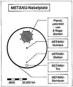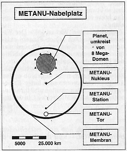 Durch METANU-Tor gelangte man nach METANU-Nabelplatz. An dem auf der Innenseite 3000 km durchmessenden Tor stand eine zweite METANU-Station. Im Zentrum des 51.000 km durchmessenden Inneren befand sich METANU-Nukleus – der Leichnam von KABBA.