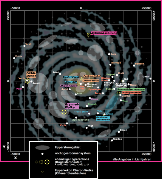 Im Sektor der Charon-Wolke, 988 Lichtjahre vom galaktischen Zentrum entfernt und rund 800 Lichtjahre unterhalb der galaktischen Hauptebene, beträgt die durchschnittliche Distanz zwischen den Sonnen nur etwa eineinhalb bis zwei Lichtjahre.