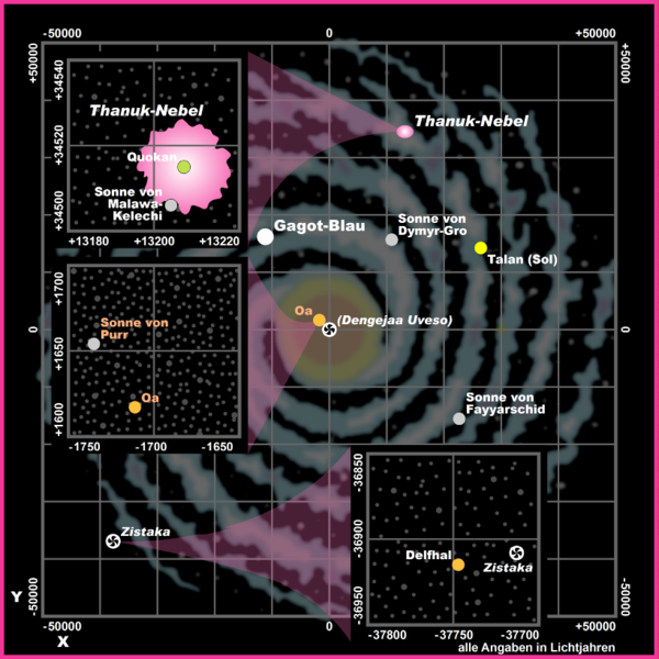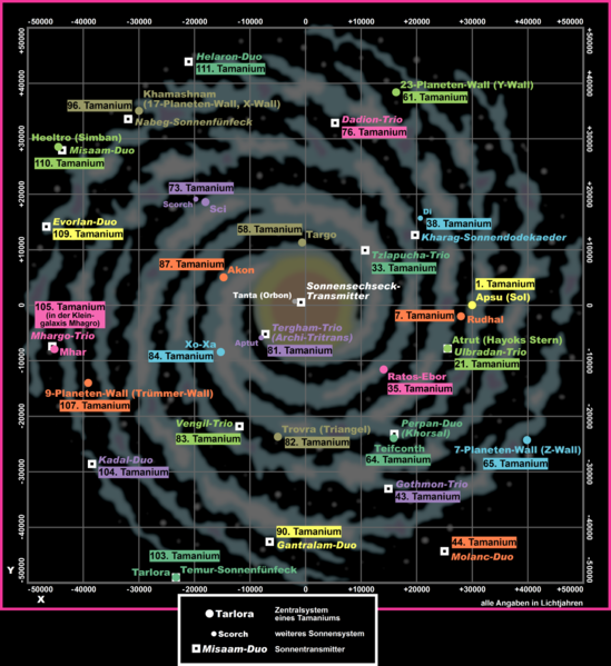 Zitat PRK-2201, von Rainer Castor: "Neben Gas- und Staubwolken, die noch für Jahrmilliarden Nachschub für die Sternentstehung liefern können, finden wir hier jüngere, metallreiche Sonnen, von denen etwa achtzig Prozent eher unscheinbare Zwergsterne sind. Der Rest setzt sich aus größeren Sonnen oder Riesensternen zusammen. Gemeinsam formen sie die Struktur der Spiralarme, die jedoch keineswegs statisch ist, sondern überaus dynamisch: Genau wie in einem Springbrunnen die gleich bleibende Form stets durch neue Wassertropfen entsteht, findet eine Wanderung der Sterne mit unterschiedlicher Geschwindigkeit statt. Eingehüllt wird die dünne von der »dicken Scheibe«, deren vertikale Ausdehnung zwischen 18.000 und 3.000 Lichtjahren liegt. Die Hauptausbreitung der Milchstraße markiert die xy-Ebene des Koordinatensystems, das seinen Ursprung im Galaktischen Zentrum hat. Das Solsystem mit Terra liegt exakt auf der x-Achse in einer Distanz von 30.000 Lichtjahren zum Nullpunkt in der Westside." Zitat Ende