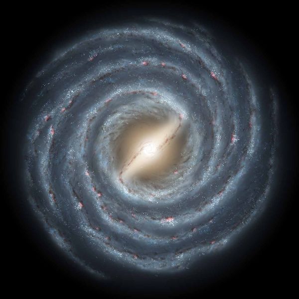 Die Milchstraße wirkt, aus großer Distanz betrachtet, wie ein riesiges spiraliges Feuerrad, mit einem Durchmesser von 100.000 Lichtjahren und ca. 200 Milliarden Sonnen.