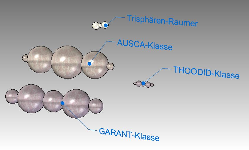 Von den Pentasphärenraumern sind der LFG die GARANT-, THOODID- und die AUSCA-Klasse bekannt. Vor dem Exodus legten die Thoogondu in der Milchstraße zahlreiche Basen mit Werften an, an denen Raumschiffe für die Rückeroberung eingelagert wurden. Unter diesen Schiffen befanden sich auch Trisphärenraumer (PR 2969, S. 6)
