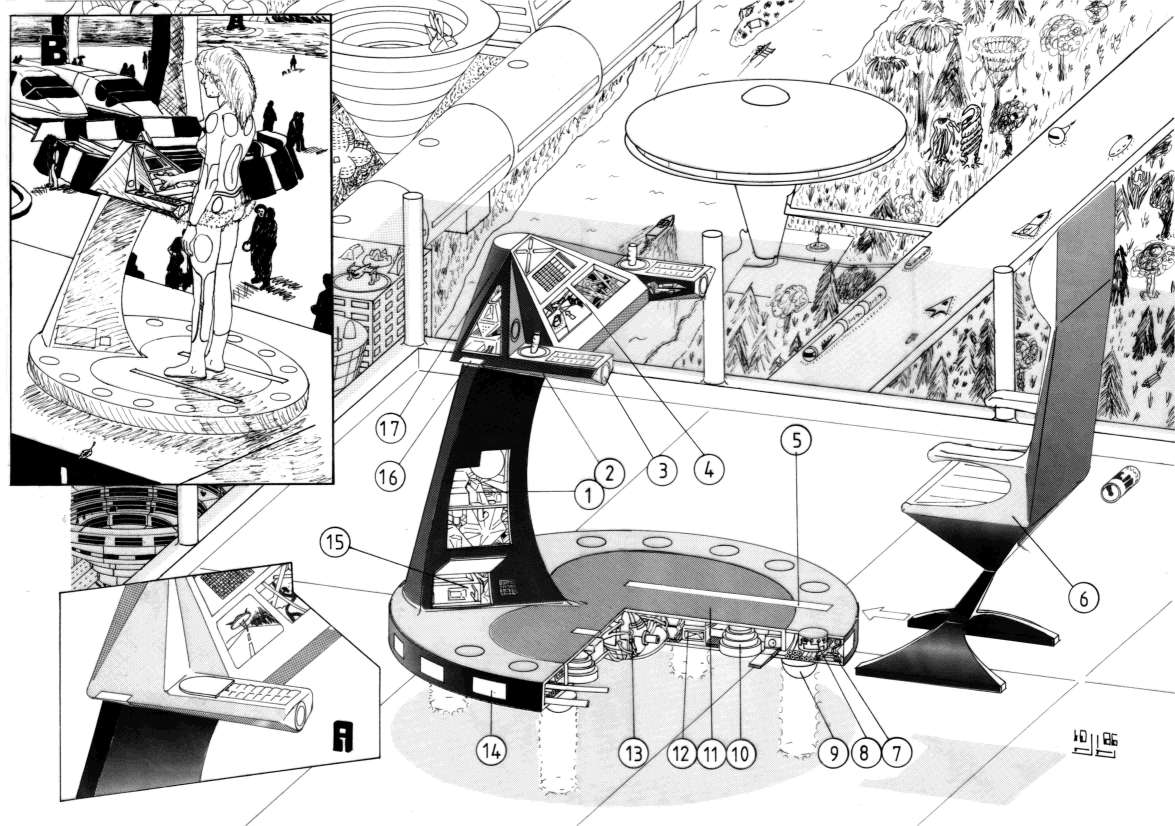 9. Kugelförmiger Prallfeldprojektorkopf; hält das Fahrzeug im Normalbetrieb etwa 30 cm über Grund (auch Wasser); durch Erhöhung der Leistung ist eine max. Steighöhe von 20 m zu erreichen; im ausgeschalteten Zustand dienen die Projektoren gleichzeitig als Auflagestützen