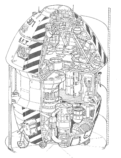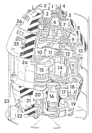 abgesprengten Personenkapsel 2. Automatischer Hyperband-Notsender 3. Ortungssystem für Linearraum Navigation 4. Konventionelle Hyperband-Antenne 5. Lageregelungs-System 6. Lebenserhaltungssystem mit Vorratsspeichern 7. Treibstofftanks des Lageregelungssystems 8. Umlaufendes Ortungsband der Normalraumortung 9. Kontursitz mit integriertem Andruckabsorber 10. Stauraum mit Notvorräten 11. Antigravschacht 12. Positronik 13. Antigravagreggat 14. Magazindeck mit Medocenter, Vorratslagern und Ausrüstungsteilen 15. Linearkonverter 16. Protonenstrahltriebwerk 17. Wandler für Reaktor und Stromverteiler 18. Energie-Pufferspeicher 19. Vorratsbehälter mit NUGAS Kugeln 20. Schirmfeldgeneratoren 21. Service- und Arbeitsrobot 22. Landestütze 23. Halterungs- und Startgerüst 24. Bodenscheinwerfer 25. aufgesprengtes Notschott 26. Projektoren der Feldantennen des Hyperfunk-Notsenders |