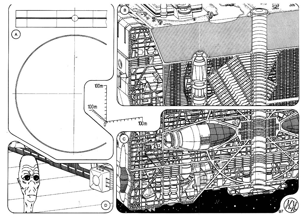 Auf den Außenseiten befinden sich technische Anlagen, Raumhäfen,