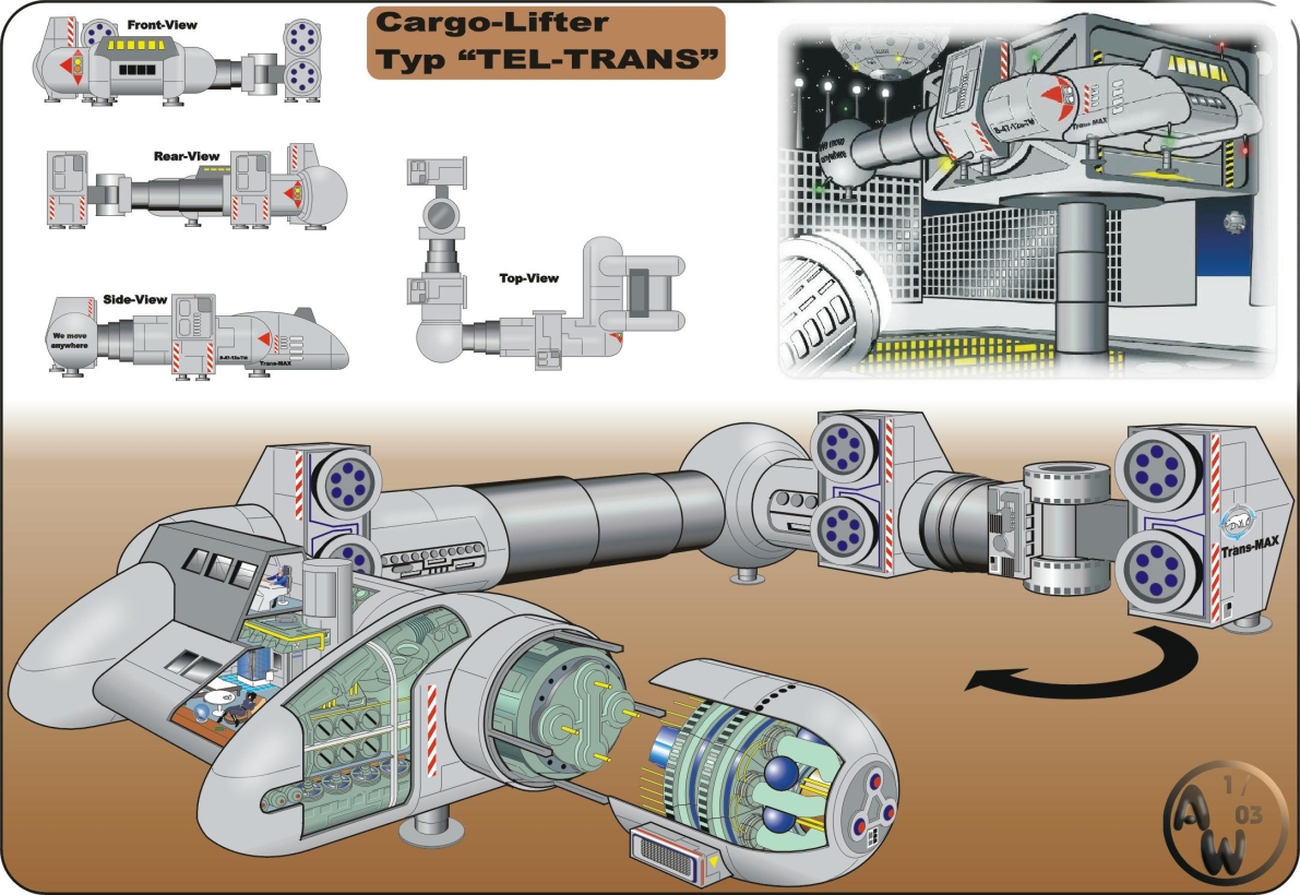 Die Risszeichnung zeigt einen modifizierten TEL-TRANS. Er erhält an seiner Backbordseite gerade ein Metagrav-Modul. Innenbords am Schiff ist der zuvor eingesteckte Gravitrafspeicher zu sehen. In der dem Betrachter zugewandten Finne befinden sich der Gravopuls-Antrieb (oben) und die Antigrav- bzw. Bordschwerkraftanlagen (unten). Das Zwischenstück birgt den Wohnbereich, den Treppenschacht zum Cockpit sowie nach außen und die Steuerzentrale.