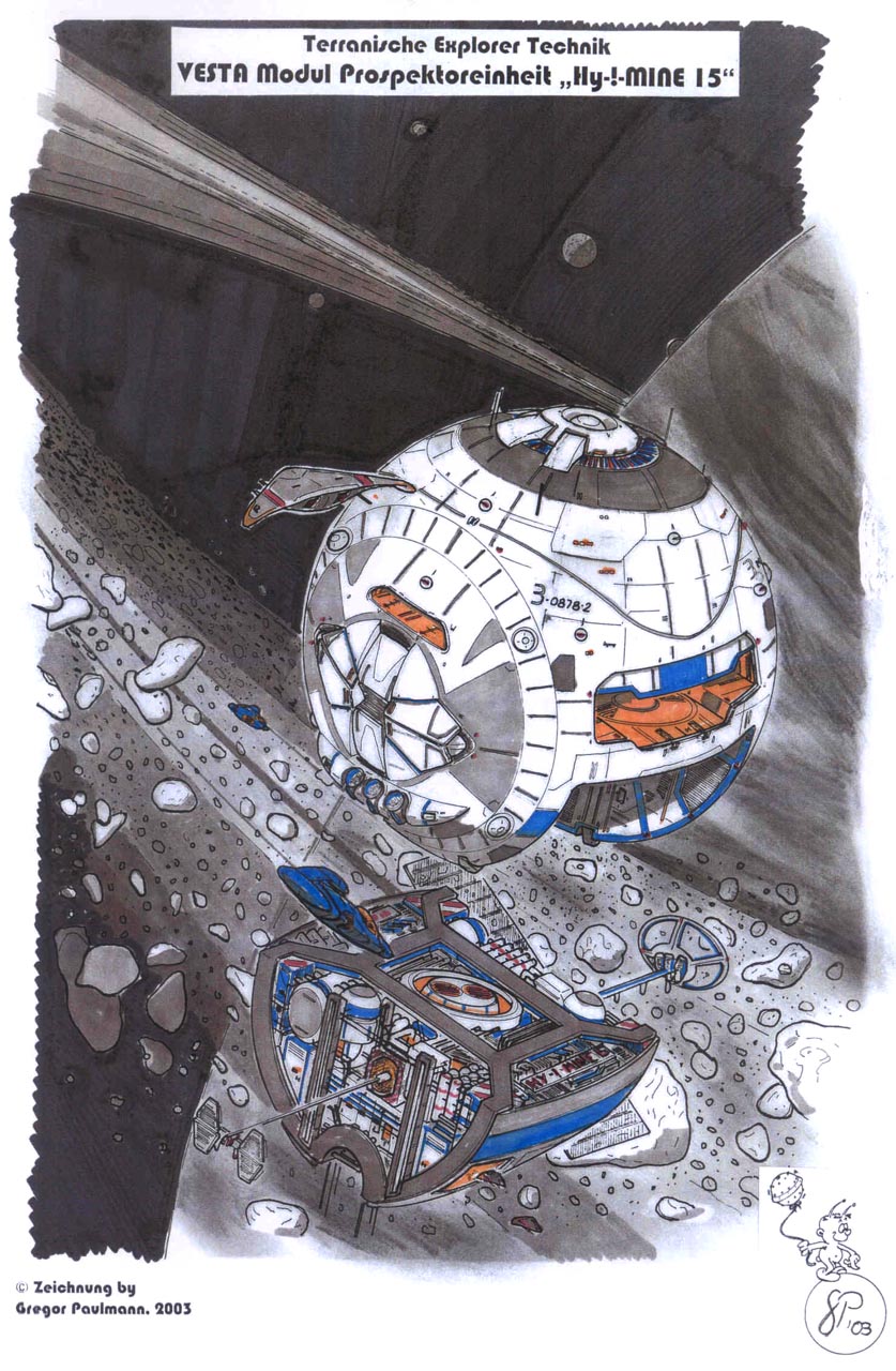 Das dargestellte Prospektormodul trägt den Eigennamen „Hy-!-MINE 15“. Als Bestandteil der Prospektorflotte der HYPERENERGETICS MINING (Firmensitz Trade City, Olymp) ist es mit seinen Schwestermodulen hauptsächlich mit der Lokalisierung, Vermessung und Vorbereitung künftiger Abbaugebiete für hyperenergetisch nutzbare Mineralien wie „CRIIPAS“ und „MIVELUM“ tätig. Das Prospektormodul wurde als VESTA-Modul konzipiert, da viele Speditionen den sehr wandlungsfähigen VESTA-Kreuzer (als zivile Version) nutzen. Die Lokalisierung und Probenentnahme selbst wird hierbei von den im Modul stationierten autonomen Spürsonden übernommen. Das MERZ-Einschubmodul hat hierbei neben der Rolle eines vollautomatisierten Geologielabors, das für die Dauer der Untersuchungen autonom arbeitet und die Ergebnisse auswertet, auch die Aufgabe der Wartung und des Transportes der eigentlichen Spürsonden. Im Normalfall wird es durch geleaste Schiffe an den Einsatzort gebracht und nach einigen Tagen wieder aufgenommen. So können wenige Schiffe größere Raumsektoren bearbeiten. Die vollsyntronischen Spürsonden selbst in der Form eines Delta-Nurflüglers haben eine widerstandsfähige Ynketerk-Zelle, die sie auch zum Einsatz auf HUS-Welten (Hochdruck-Ultra-Schwerkraft) befähigt. Sie sind mit robusten Gravopuls-Triebwerken (kombinierte Innenstrom-GRAVO-Jettriebwerke und Impulstriebwerke) und Antigrav ausgerüstet. Neben einer Anzahl von spezialisierten Ortern für die gesuchten Mineralien haben sie auch die Möglichkeit, mit Hilfe eines kleinen Desintegrators und eines Traktorstrahlers Gesteinsproben zum Prospektormodul zu transportieren bzw. einen Prospektorroboter abzusetzen und wieder aufzunehmen. Dieser Prospektorroboter führt selbstständig Bohrungen und Entnahme von Proben bis in Tiefen von etwa 5000 Metern durch. Der Konflikt mit dem Reich TRADOM am Hayok-Sternenfenster führte zu einem stark erhöhten Bedarf der Hyperkristalle „ECLISSE“ und „CV-EMBINIUM“, die zwingend zur Konstruktion der wichtigsten Abwehrwaffen, dem Paradim-Panzerbrecher (PDP) und seiner terranischen Weiterentwicklung, dem PDP-Distanznadler, notwendig sind. Die Regierung der LFT requirierte daraufhin kurzfristig alle zur Verfügung stehenden Prospektoreneinheiten der großen Minengesellschaften, um neue Fördergebiete für diese Minerale zu erkunden. In der Darstellung ist das Modul Hy-!-MINE 15 gerade von einem VESTA-Kreuzer der LFT abgesetzt worden. Der Orbit um einen Gasriesen wurde auch aus Tarnungsgründen sehr dicht an seinem an Hypermineralien vermutlichen sehr reichhaltigen Trümmerring gewählt. Einige der Spürsonden sind bereits gestartet. Der Kreuzer der neuesten VESTA-Generation Mark 5 (Kennung S.N.C. 3-0878-2 CORBIN HEAD) hat gerade zwei Kleinst-Space-Jets ausgeschleust, um eine letzte Sicherheitserkundung vor seinem Abflug durchzuführen.