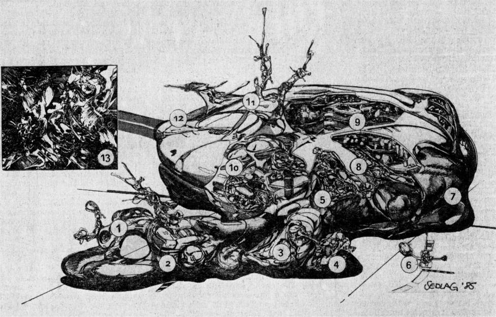 2.Rechts: Enerspi-Antriebsgondeln für Unter- und Überlichtflug Links und darüber: Virenspeicher und Konverteranlagen, Fabrikationsanlagen und Hangars