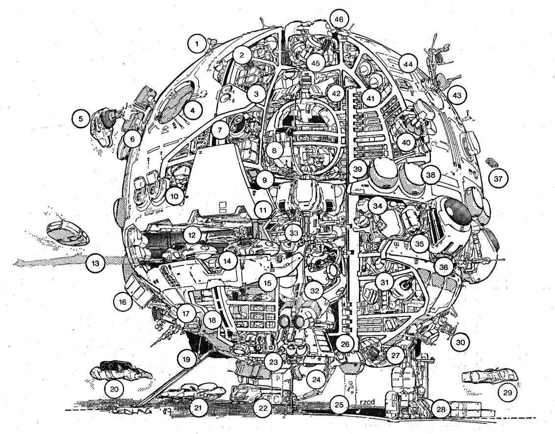 8.Sondergeschützte Zentralkugel mit Leitzentrale, Zentralsyntronik und konventionellen Positroniksystemen, Notunterkünften sowie dem Herzstück des LEH-Systems (zur besseren Darstellung ist die Zentralkugel teilweise freigestellt)