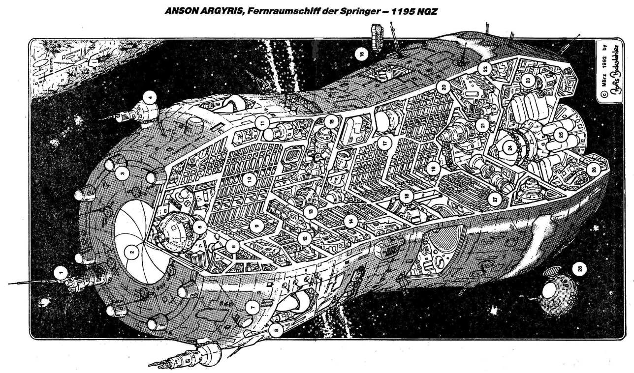 Die ANSON ARGYRIS ist eines der vielen Fernraumschiffe, die für den Dienst für das Galaktikum in der zweiten Hälfte des 12. Jahrhunderts NGZ gebaut wurde. Im Rusuma-System hergestellt,wurde dieses Springerschiff für die Erforschung, Analyse und Weitergabe astrophysikalischer Daten - besonders fünfdimensionaler Struktur - entwickelt.