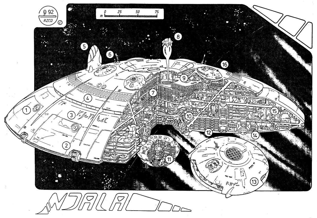 kommt die am unteren Pol befindliche Halbkugel-Konstruktion, die die Hauptschaltzentrale des Schiffes enthält. Diese Halbkugel ragt im eingedockten Zustand nochmals um 40m aus dem Diskus, so daß sich eine maximale Gesamthöhe von 120m für das Hauptschiff ergibt. Wie schon gesagt, kann die untere Halbkugel vom Diskus getrennt werden, um so eigenständig zu agieren oder in Notfällen Rettung zu suchen. Die Halbschale ist für sich autark und läßt dann ein manövrierfähiges, aber nicht mehr ganz so effektives Hauptschiff zurück. Die NJALA ist in erster Linie ein Forschungsschiff, das sich aber durch eine hervorragende