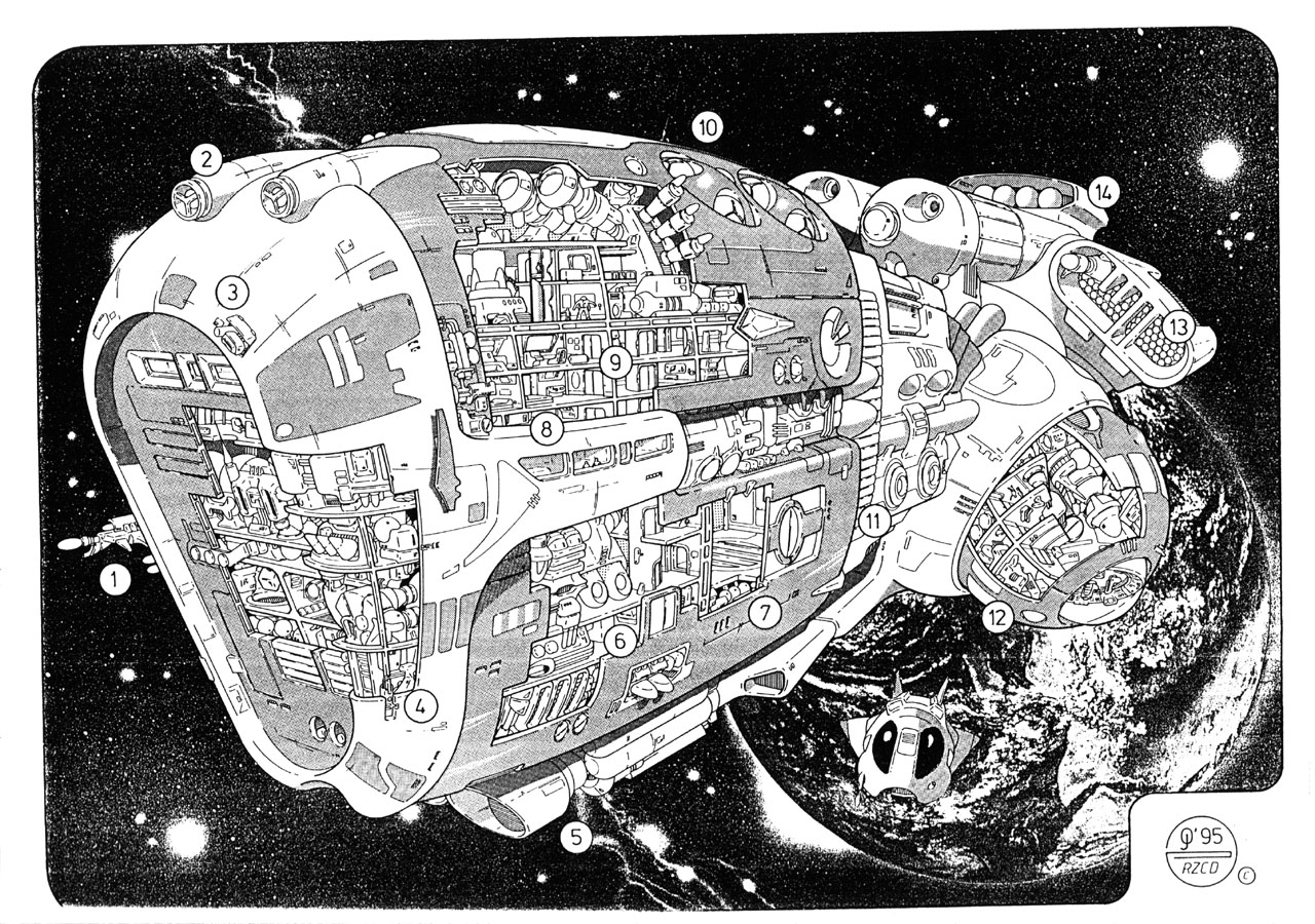 Fensterfron des Laborbereichs 9. Aufenthaltsräume und Wohndecks 10. Je zwei links und rechts liegende, Kugelsektorkombinationsgeschütze. 11. Seitliche Sensorenbatterie 12. Eins von zwei, 45 Meter Beibooten 13. Haupt- Metagravblöcke des ÜL-Antriebs 14. Haupt- Schirmfeldprojektor |
