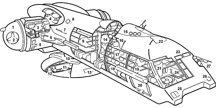 Technische Daten: Länge : 195 Meter Durchmesser Hauptrumpf : 42 Meter Durchmesser Seitengondeln : 29 Meter Höhe Hauptrumpf : 60 Meter Höhe Diskusbeiboot : 10 Meter Durchmesser Diskusbeiboot : 60 Meter Defensivsystem : Morphisches Tarnsystem mit Virtuelbildner für Fremd- und Mehrschiff- konfigurationen Zeichenerklärung: