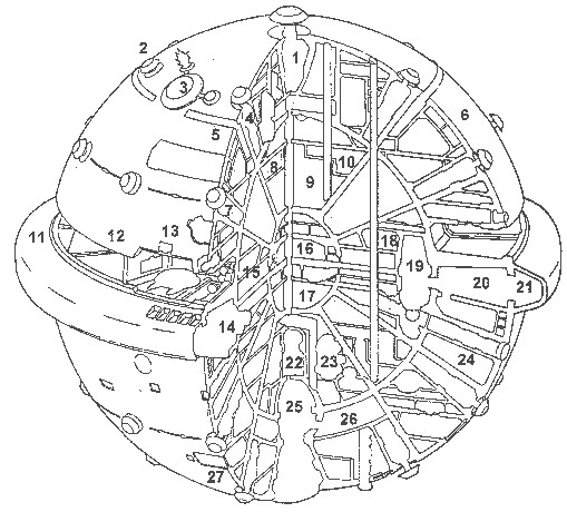 Abstrahlemitter 2. MVH-Geschütz 3. Energieteleskop und astronomische Ortungsanlage 4. Transformkanone 5. Ortungs- und Funkanlagen 6. Paratronschirm Projektoren 7. MVH-Geschütz 8. Lebenserhaltungssystem 9. Medostation, Freizeiträume 10. Andruckneutralisator 11. Ringwulst mit Triebwerksprojektoren 12. Frachthangar in Ringform 13. Traktorstrahlprojektoren 14. Gravopulstriebwerk15. Lebenserhaltungssystem 16. Hauptleitzentrale 17. Syntronische Computeranlage 18. Energieumformer des Not- Nugasreaktors 19. Not-Nugasreaktor (2 Stk.) 20. Metagravtriebwerk 21. Metagrav- und Grigoroffprojektor 22. Energieverteiler des Hypertrops 23. Antigravtriebwerk 24. HÜ-Schirm Generatoren und Projektoren 25. Hypertrop 26. Haupt-Gravitraf-Speicher 27. Frachthangar |
