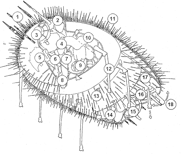 Sensorik und Aufrißprojektoren für Hyperflugtriebwerk 2. Generator für Defensivschirme 3. Gradientenprojektor des Sublicht-Triebwerkes 4. Haupttriebwerksblöcke für Sub- und Überlichtflug. 5. Haupthangar und Traktorstrahler 6. Hangar für Doppelstabroboter, Wartungseinrichtungen und Magazine 7. Zentrale, Unterkunftsbereich und Lebenserhaltungssysteme 8. Transitionsschleuder mit Versogungsagregaten 9. Interner Zapfdom des Hypertrops |