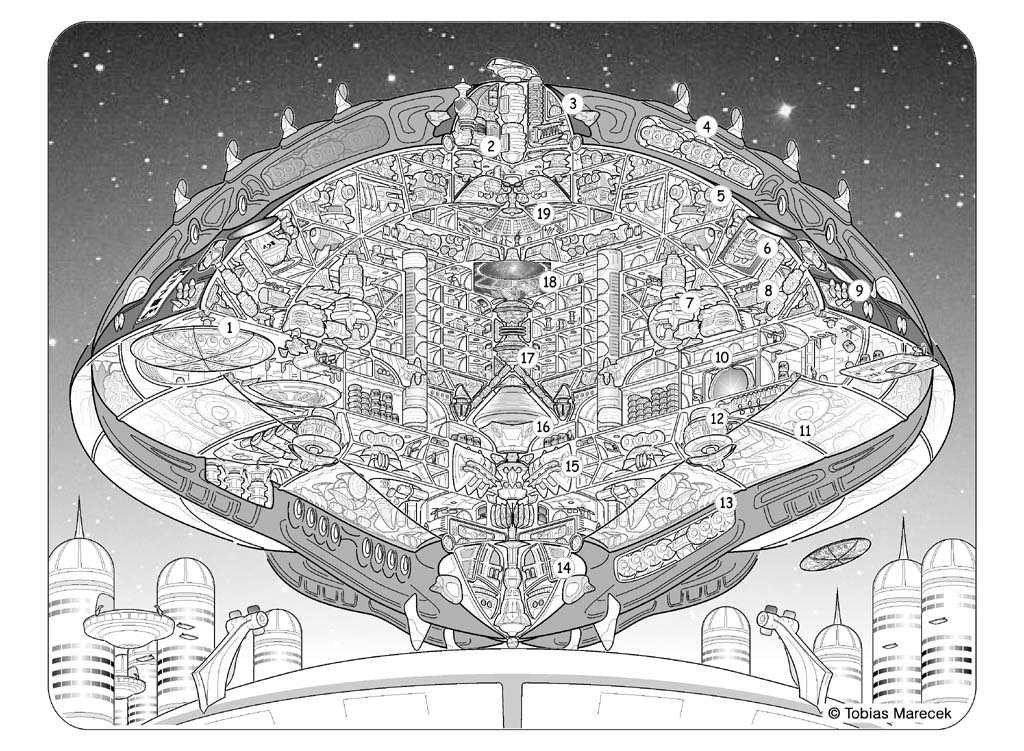 | Antrieb: | Überlichttriebwerke (diese erzeugen eine Feldblase ähnlich der Grigoroff-Schicht, die jedoch einen jederzeit unterbrechbaren Flug gestattet), gravomechanischer Feldantrieb, Antigravtriebwerke |