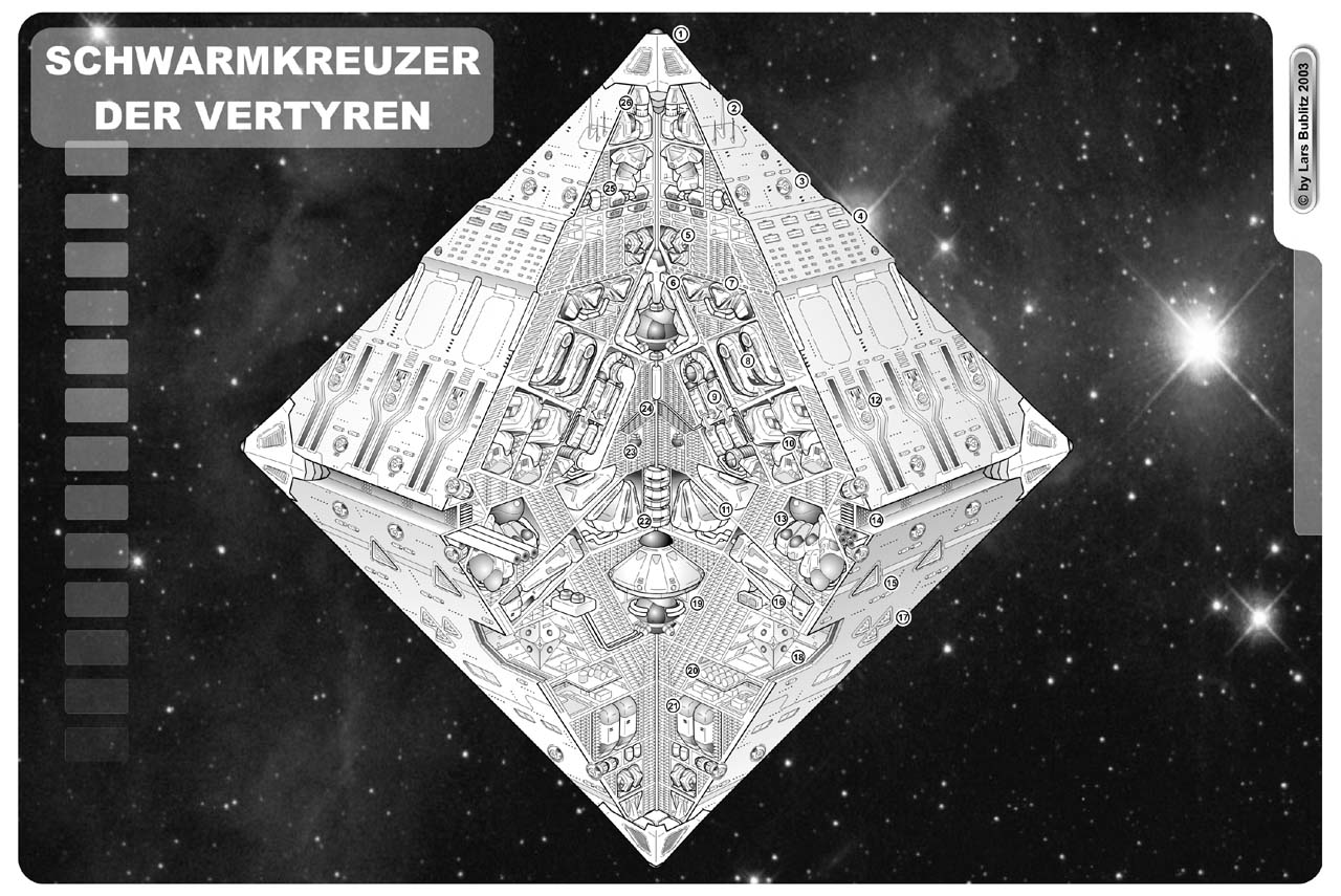Vertyren sind im Durchschnitt 2,30 Meter groß und von humanoidem, sehr kräftigem Wuchs mit drachenhaftem Schädel und glühenden Augen. Zwei knochige Flügelrudimente dienen zum Tragen von Lasten. Die so genannten Schwarmkreuzer sind das Rückgrat der Kriegsflotte. Ihre Kantenlänge beträgt 890 Meter bei einer Höhe von rund 1260 Metern. Andere Schiffsgrößen sind als »Schlachtschiffe« oder »Kys-Yanum« bekannt. DieTechnik der Vertyren basiert auf einem Gemisch aus Halbraum- und Paratron-Anwendungen. Während der Antrieb eine Kombination von Impuls- und Lineartriebwerk darstellt (bis zu 940 km/s2 Sublichtbeschleunigung; Überlicht-Fak-tor bis zu 60 Millionen), werden als Schutzschirme paratronähnliche Schirmfelder verwendet. Die Energieversorgung erfolgt durch Schwarzschildreaktoren (Energieerzeugung durch Gravitationskollaps gepulst eingeschossener Protonen); es wird jedoch auch Sonnenzapfung betrieben. Waffensysteme sind Thermostrahler, Desintegrator, Paralysator sowie übergeordnete Formen überlichtschneller Strahlen ähnlich einer Intervall- oder Konstantriss-Nadelpunkt-Kanone.
