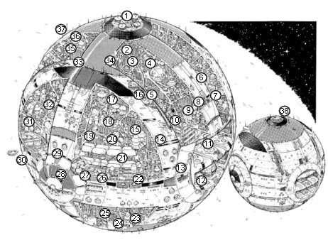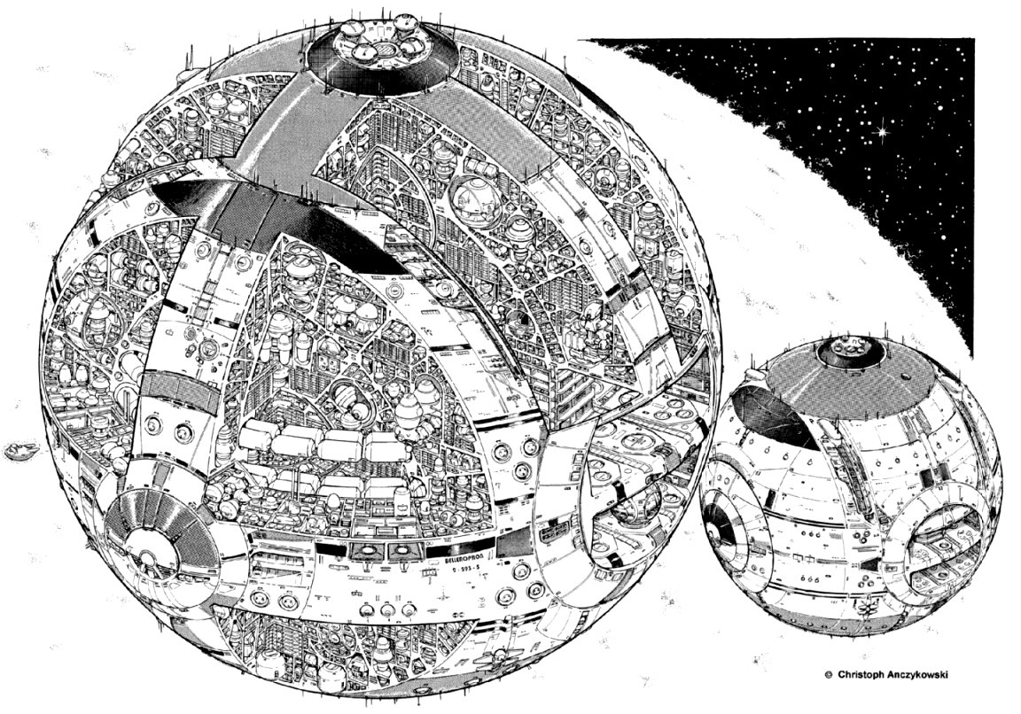 3.Kugelförmige Kommandozelle mit Hauptsteuerzentralen, syntronisch-positronischem Hybridrechner, Notfallquartieren, primärer Medostation und Lebenserhaltungssystem, sowie autarken Energie- und Schirmfeldaggregaten