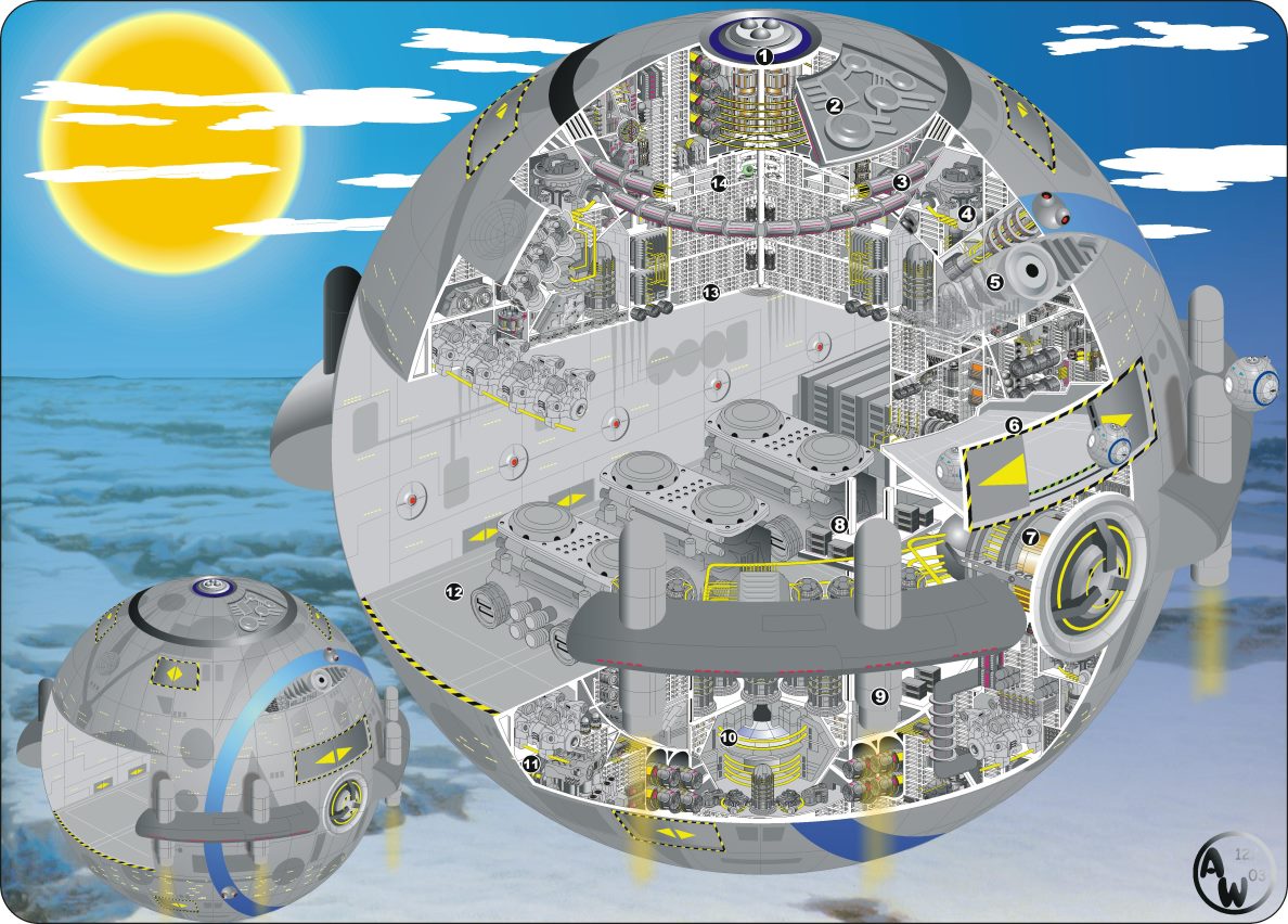 In aller Eile werden Frachter ebenso wie Schiffsneubauten zu Versorgern umgerüstet. Das dargestellte Modell ist ein militärischer Versorger, der Umbau einer 800 Meter durchmessenden Schlachtschiffszelle der KOBAN-Klasse. Weil konzeptionsbedingt nicht sehr viel freies Volumen geplant war, fallen die Umbaumaßnahmen ausgesprochen umfangreich aus.