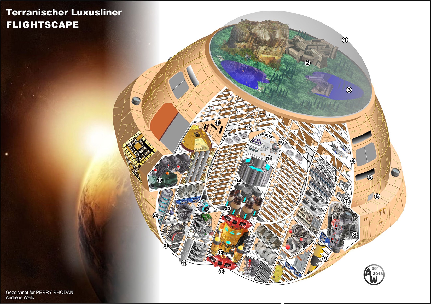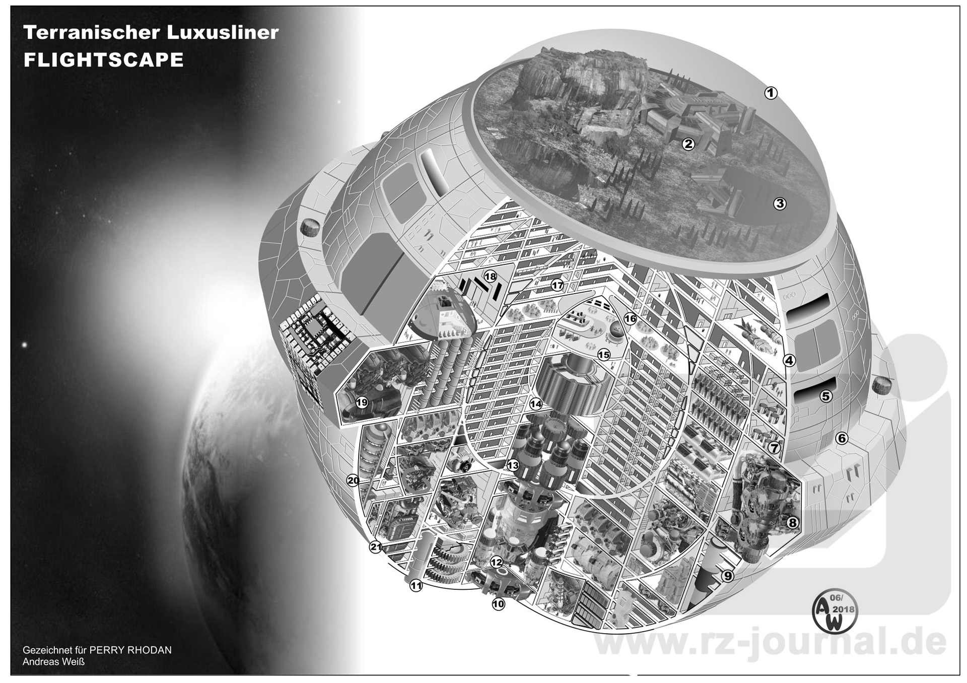 Urlaub ist auch in der fernen Zukunft wichtig und wird auf verschiedenste Arten genossen. Das Thema Kreuzfahrt ist dabei seit der Präkosmischen Ära ein Dauerbrenner. Fuhr man früher mit Schiffen über die Meere, so kreuzt man heute durch das All von Sehenswürdigkeit zu Sehenswürdigkeit, optische Rückblicke in die Vergangenheit (vor allem der sogenannte Schwarm-Tourismus) eingeschlossen. Die Strecken sind länger, aber das Prinzip ist immer gleich geblieben. Das dargestellte Schiff ist ein Kugel-Liner der ORION Cruises Company. Mit einem Kugelzellendurchmesser von 450 Meter liegt er im Vergleich zu den bis zu 1000 Meter durchmessenden Superluxus-Kreuzfahrtraumern anderer terranischer Kreuzfahrtlinien im mittleren Größen- und Preisbereich. Schwerpunkt ist hier die während der Fahrten von Station zu Station hell erleuchtete Biotopkuppel auf dem oberen Pol. Sie ist ein Standardmodul, das auch bei der Errichtung von Urlauber-Raumstationen zum Einsatz kommt. Technische Daten: